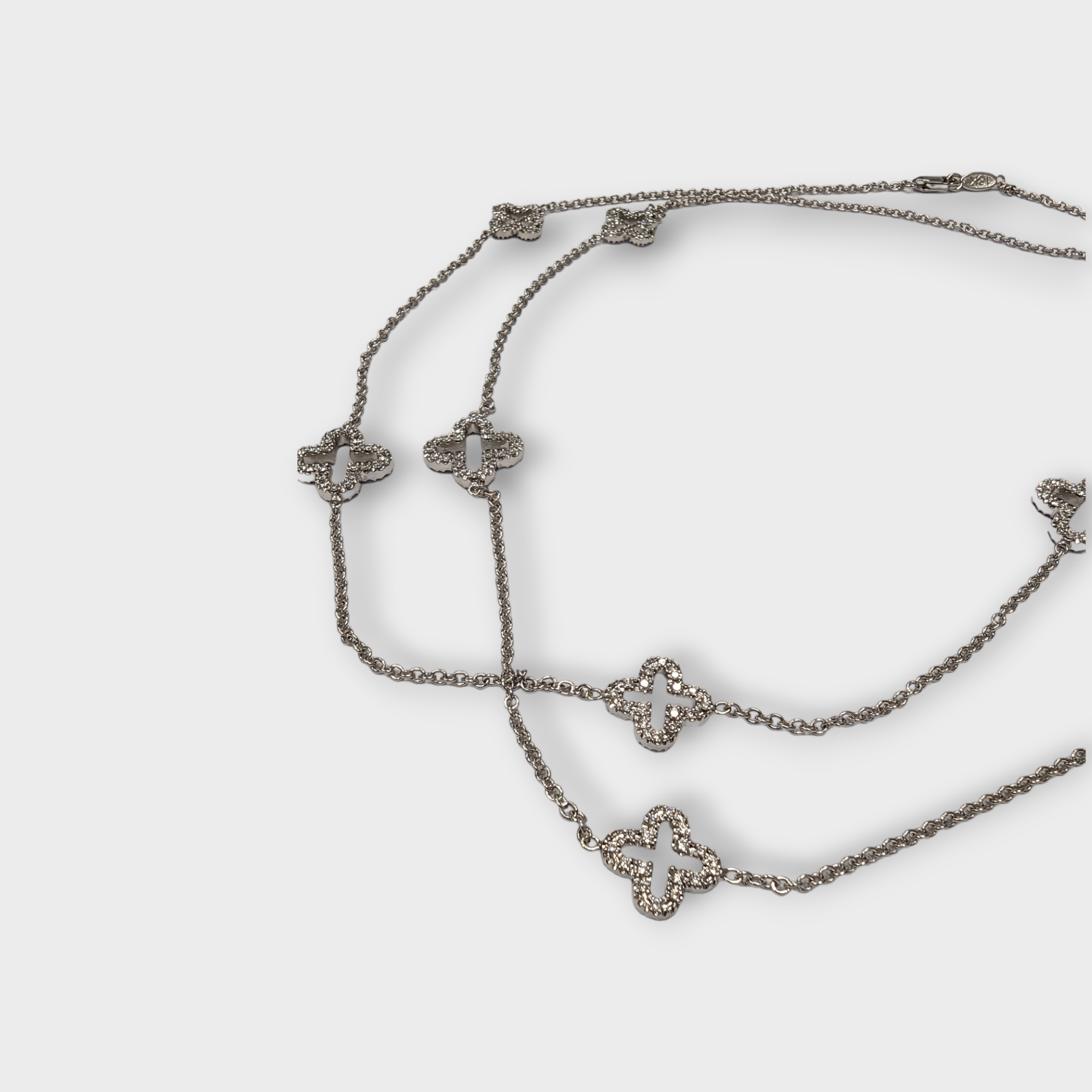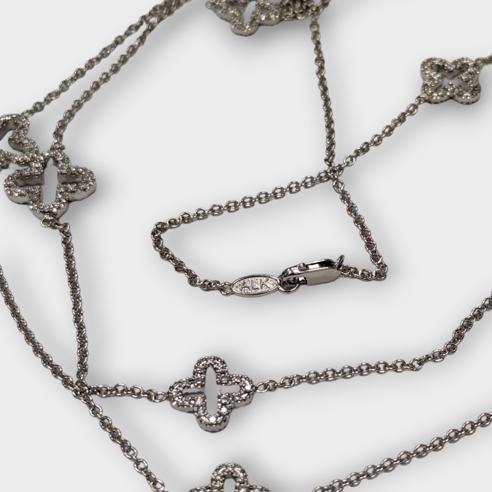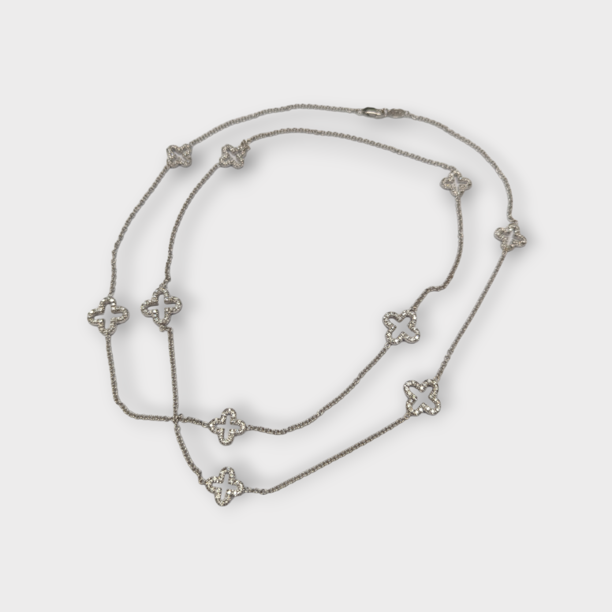 Crafted in 18k white gold, clover designs are stationed along a cable chain and embellished by diamonds front and back 3.84 CTTW